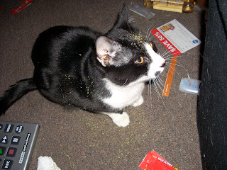 As I sit here watching two kitties sleep the little Sylvester plays with the catnip ball.